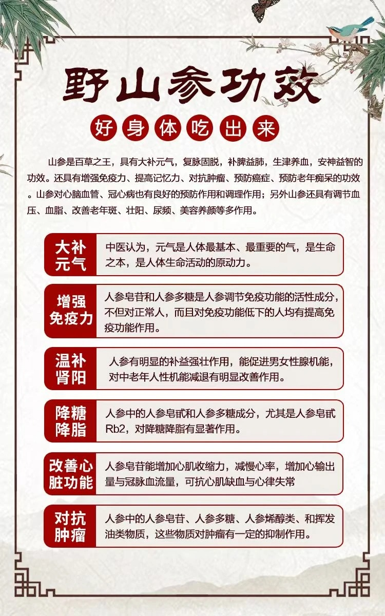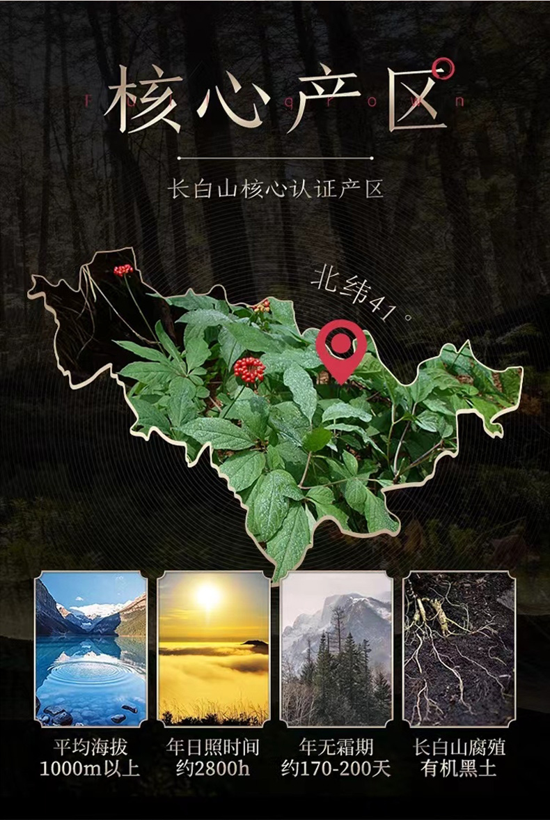 含有人参皂苷、人参多糖、人参蛋白等生物活性成分,被誉为百草之王,稀世珍宝,民间称人参为“长白山三宝之首”。