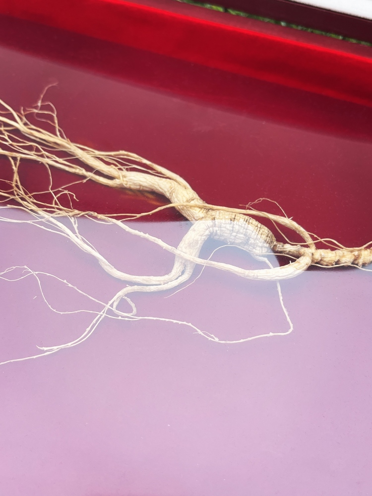 须 : 支根上生长的较细的根,须根细长,柔韧性强,有弹性、有珍珠点。