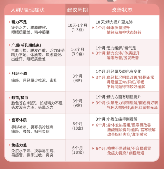 适用人群:由气血不足引起的手脚冰凉、痛经、月经不调、宫寒、缺铁、贫血、免疫力差、脸色苍白、精力不足、失眠等人群。