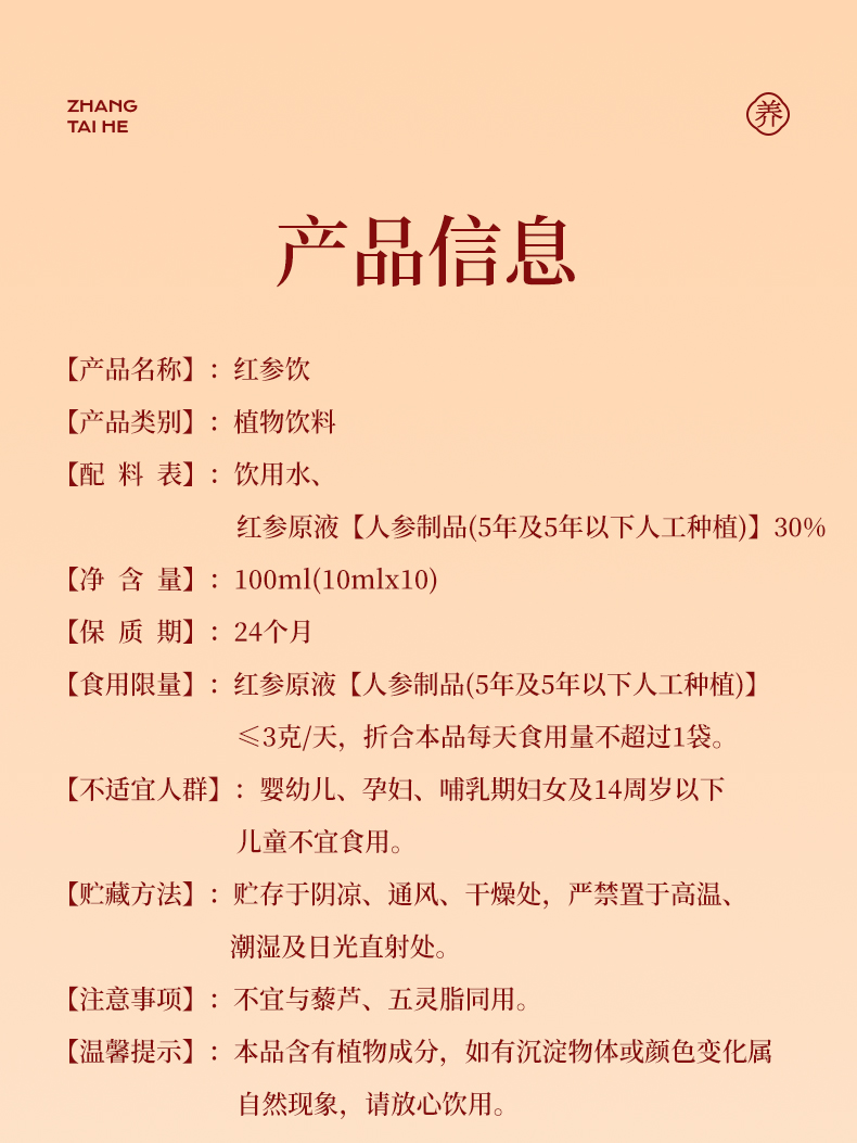 4.零添加:配料仅含 “水 + 红参”,无防腐剂、蔗糖、色素、香精和增稠剂,饮用更安全健康。