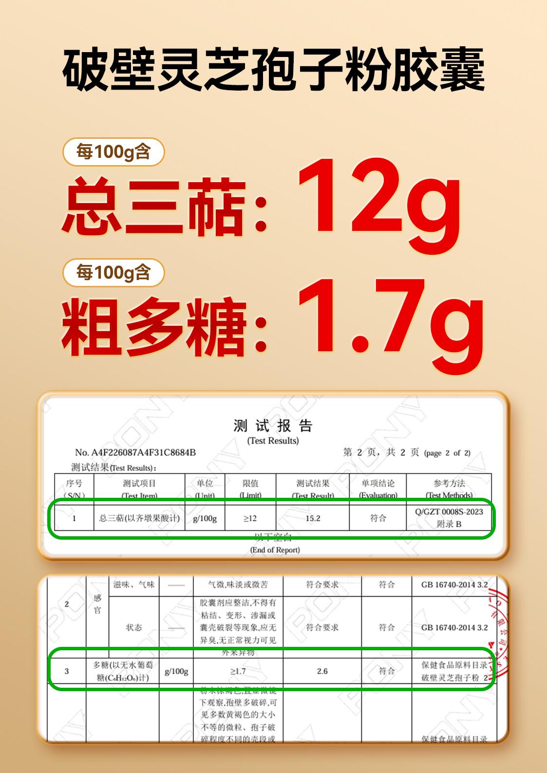 ③原料是选自7-50天黄金喷粉期的孢子粉,同时利用去瘪技术,筛除干瘪、低效孢子,使灵芝三萜、灵芝多糖等有效成分更多。产品批文标准为每 100g 含总三萜 12g、粗多糖 1.7g;经第三方检测,本品实际总三萜含量达 15.2g/100g,粗多糖达 2.6g/100g,有效成分实测值显著高于批文要求。