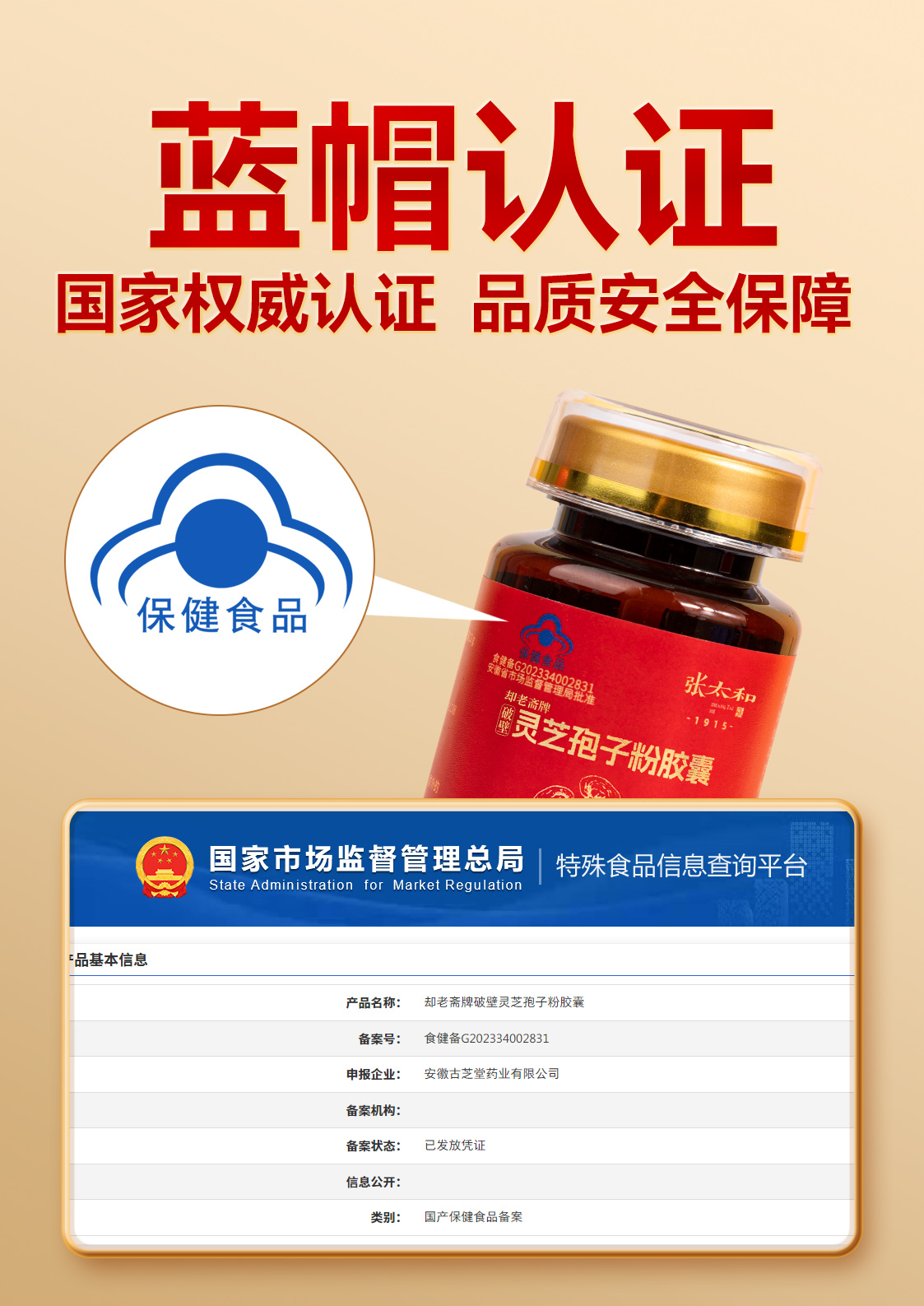正规的保健食品都会在产品外包装盒上,标有天蓝色、形如“帽子”标志,下方标注出该保健食品的批准文号。张太和孢子粉就是蓝帽子产品哦~