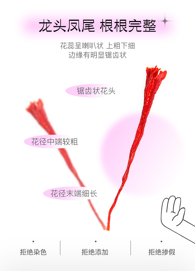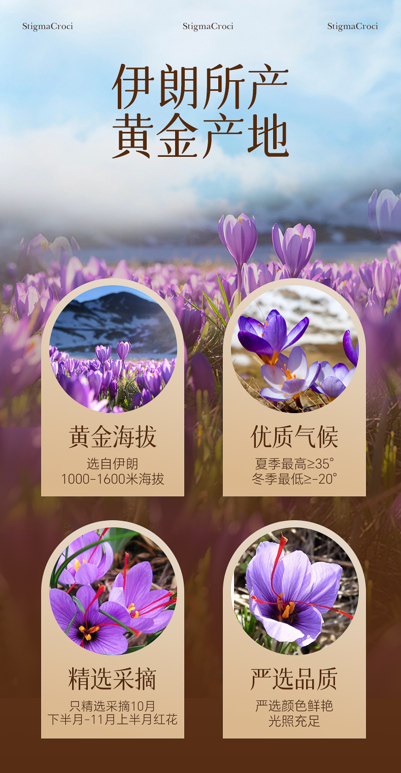 1.当季新花:清晨采摘第一年新开的头花,藏红花的活性物质含量最高