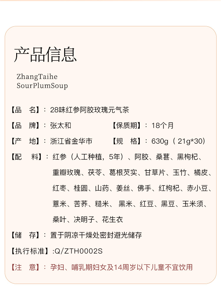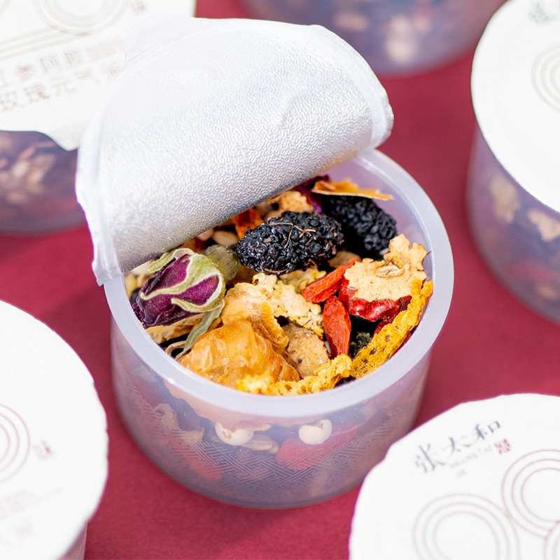 张太和红参阿胶玫瑰女神茶甄选28种草本食材,(红参、阿胶、黑枸杞、桑葚、玫瑰花、茯苓、葛根、芡实、甘草片、玉竹、橘皮、红枣、桂圆、山药、姜丝、佛手、红枸杞、赤小豆、薏米、苦荞、糙米、黑米、红豆、黑豆、玉米须、桑叶、决明子、花生衣。)合理搭配,以茶养颜,喝出好气色。