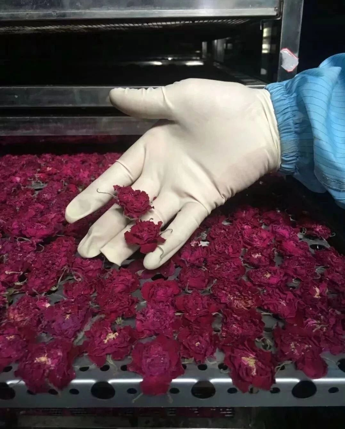 采用低温除湿热泵技术,经十二小时全过程温度低于55℃低温烘干,保留了玫瑰花天然色素和香气成分,产品色泽呈深紫色,香气极佳。