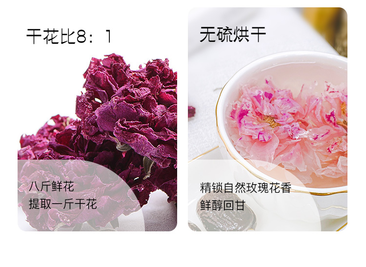 精选玫瑰花冠,无硫烘培、不加色素、干花比8:1、低温锁鲜、自然花香。