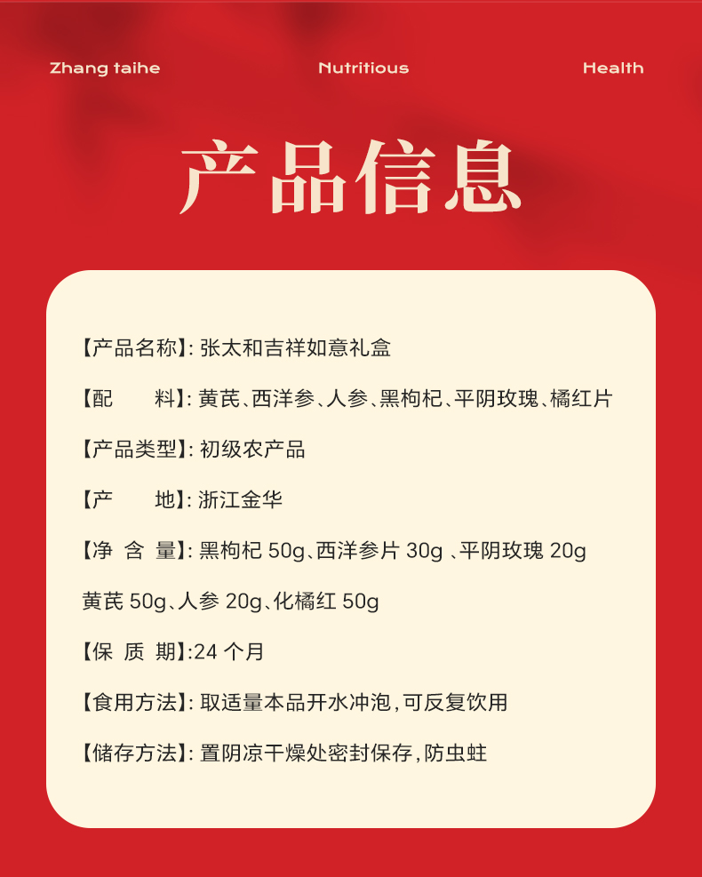 3、花青素之王,白净无暇肌【青海黑枸杞】;足龄好参,为健康充电【长白山西洋参】;疏肝解郁,活血止痛【平阴玫瑰】;气色饱满,补气健脾【甘肃黄芪】;燥湿化痰,理气消食【广东橘红】;大补元气 煲汤佳品【长白山人参】