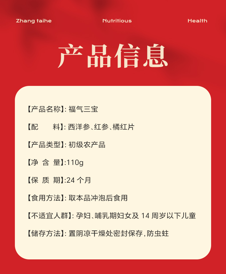 福气三宝:【西洋参】0.8cm 30g。【红参】30g。【橘红】50g