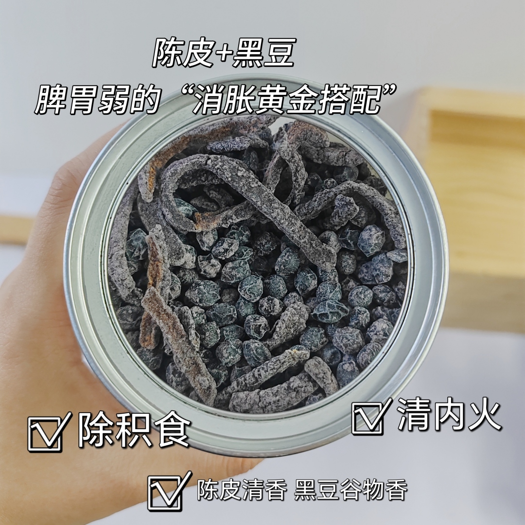 黑豆与陈皮二者相结合有祛湿降燥,疏肝理气,健脾化痰的效果。