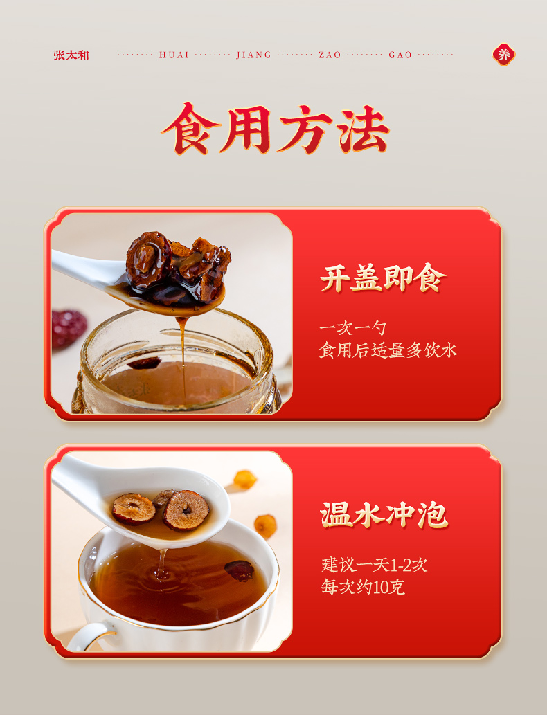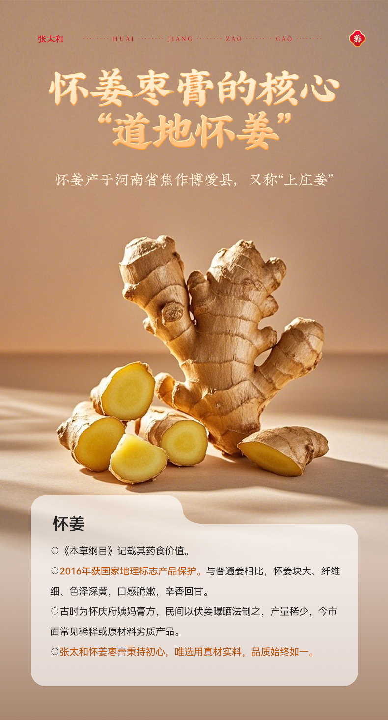 张太和怀姜枣膏是用老怀姜汁,加入枸杞、桂圆、红枣、红糖等成分制作而成纯天然绿色食材,经过传统工艺熬制而成营养更加全面。历时十几个小时,将精华提取出来、帮助提升免疫力、抵抗力,调理体寒血虚等问题。