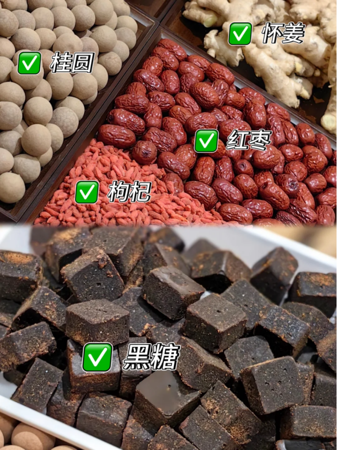 红糖:红糖味甘,性温,入肝、脾、胃经,能够补中缓肝,活血和瘀。《医林纂要》:"暖胃,补脾,缓肝,去瘀,活血,润肠。"