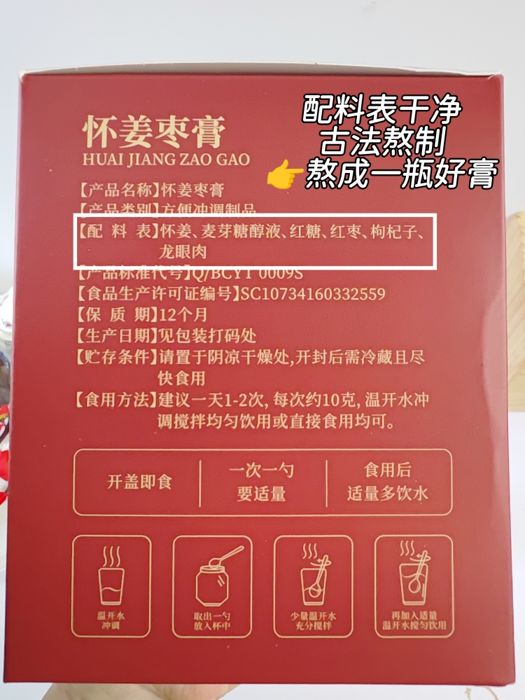 1.怀姜枣膏沿用药王的传统古方,经过不断的改良调配,加入了红糖、红枣、枸杞、桂圆与姜汁结合在一起,减少了姜原本辛辣刺激的味道,实现了食材营养的互补叠加。