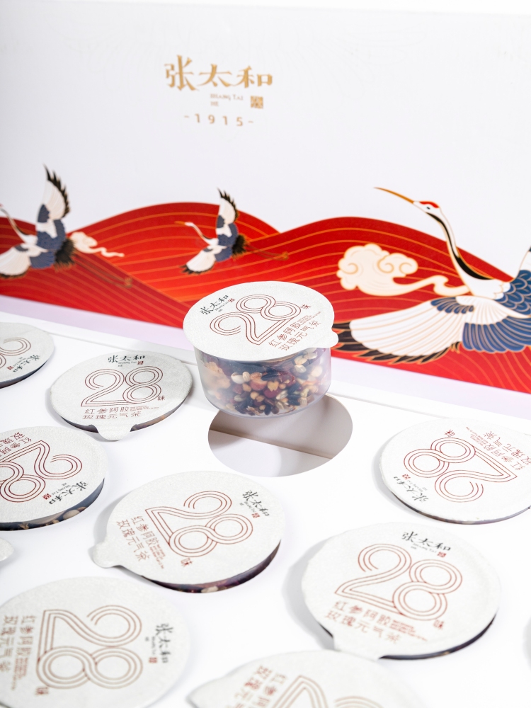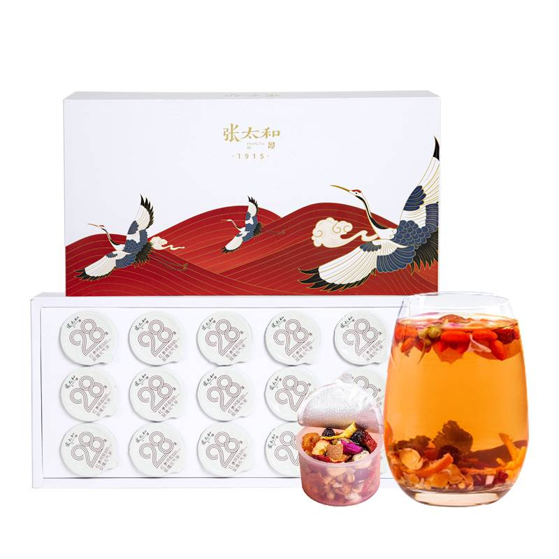 张太和红参阿胶玫瑰女神茶甄选28种草本食材,(红参、阿胶、黑枸杞、桑葚、玫瑰花、茯苓、葛根、芡实、甘草片、玉竹、橘皮、红枣、桂圆、山药、姜丝、佛手、红枸杞、赤小豆、薏米、苦荞、糙米、黑米、红豆、黑豆、玉米须、桑叶、决明子、花生衣。)合理搭配,以茶养颜,喝出好气色。