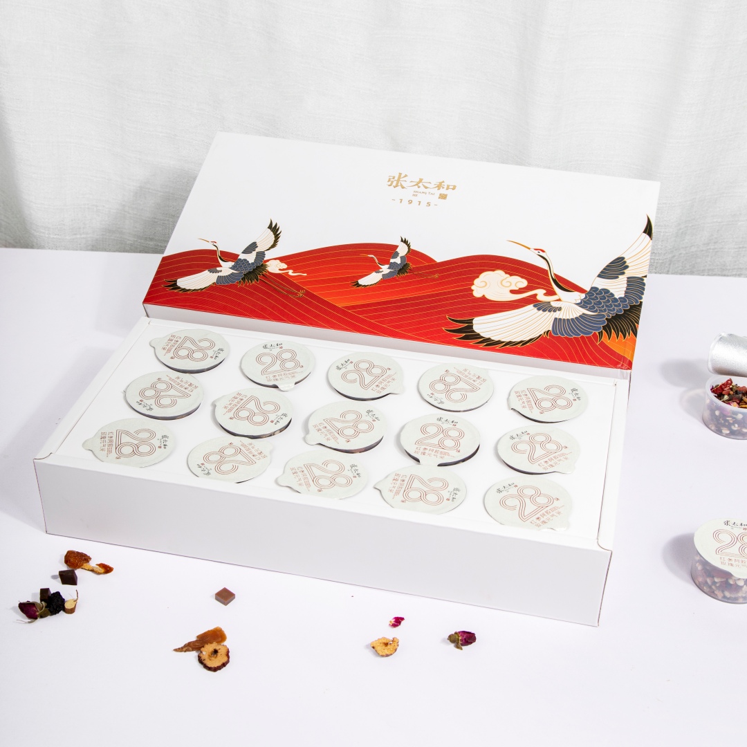 张太和红参阿胶玫瑰茶满是补气养血,美容养颜的黄金成分。高配四宝,滋补食材看得到,一盒内有约2整块阿胶,约10支定制红参主干,约30颗桂圆肉,约100朵重瓣红玫瑰。而且都采用充氮小罐装,密封锁鲜,防虫防潮,清晰可见粒粒饱满的原料,完全无添加,无熏硫的,人工甄选无碎渣。