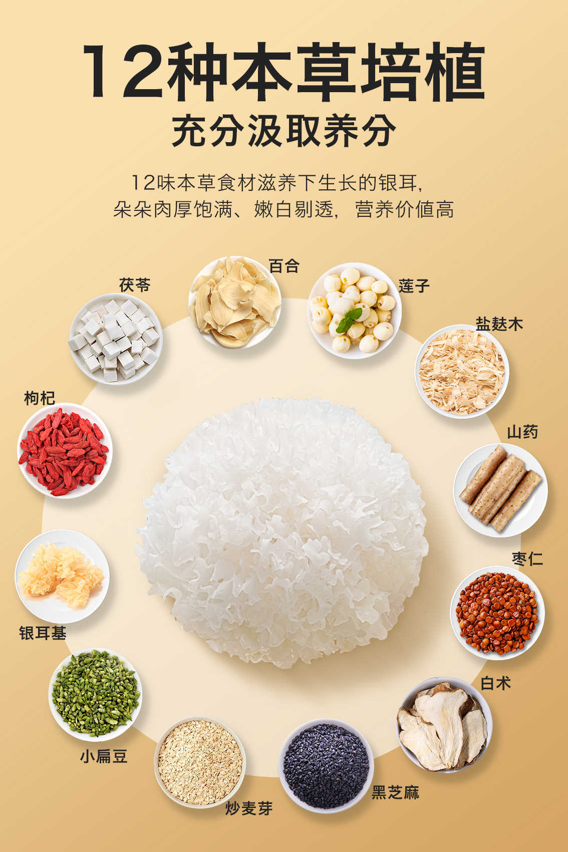 这款本草银耳培养基用茯苓、百合、莲子、枸杞、银耳基、盐麸木、山药、枣仁、小扁豆、炒麦芽、黑芝麻、白术这12种本草食材作为培养基,底层营养丰富!