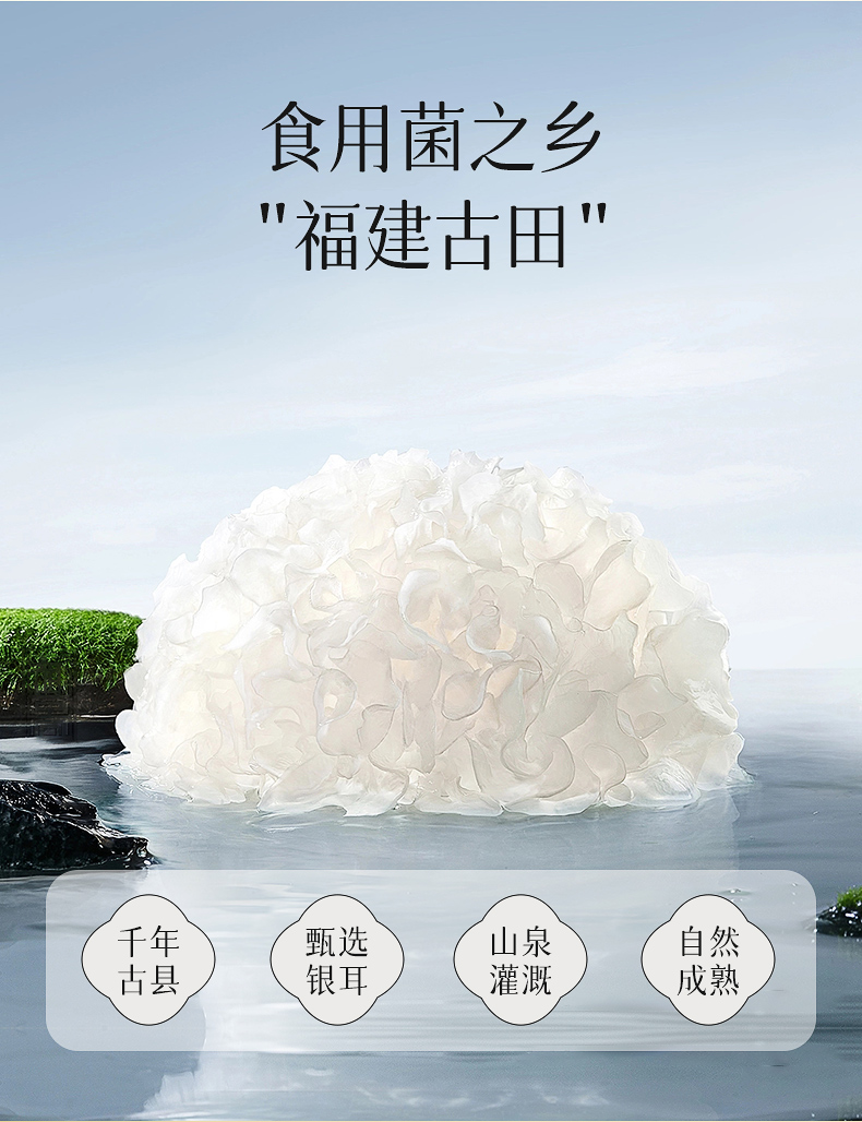 1、源于“中国银耳之乡”的福建古田本草银耳,于海拔1400多米的高岗山栽培种植,山泉水灌溉,自然生长无干预,其特点:质厚、肉嫩、易炖化,营养价值高,是历代皇家贵族滋补佳品。