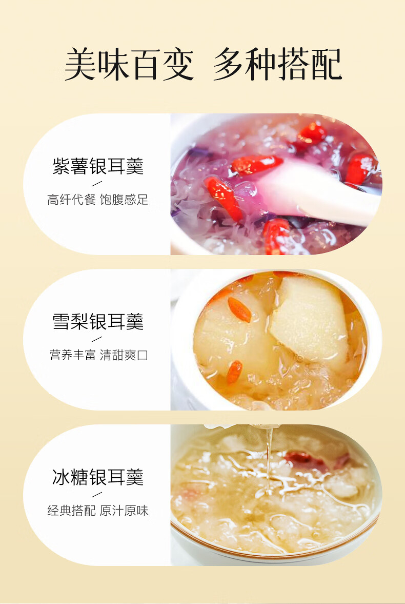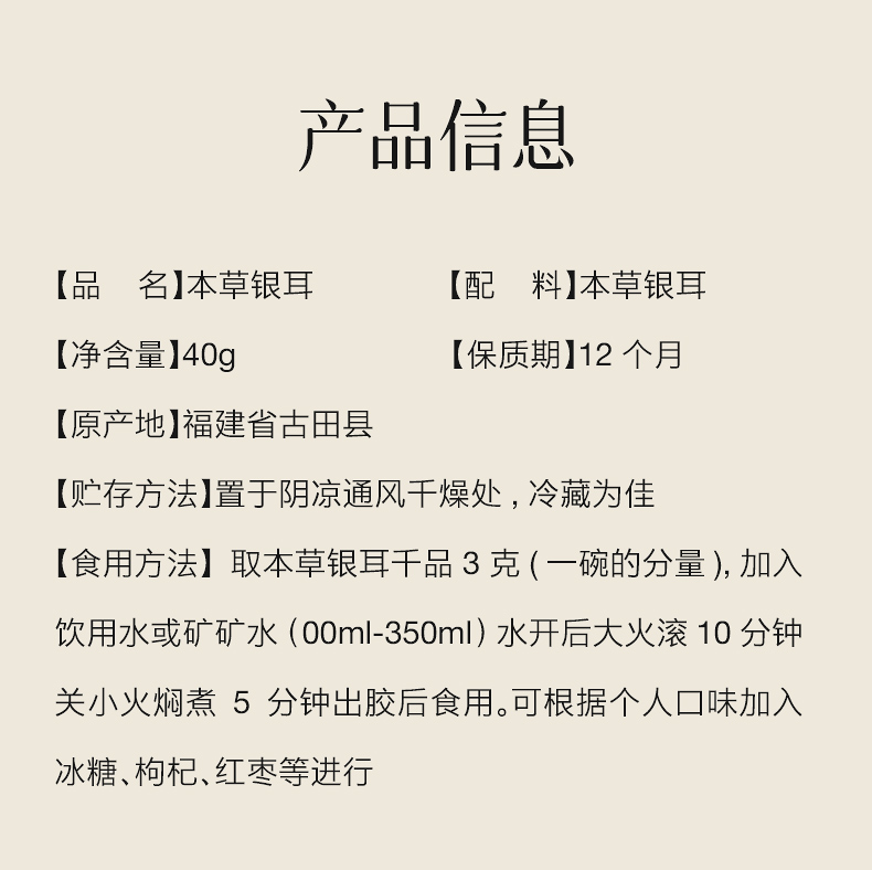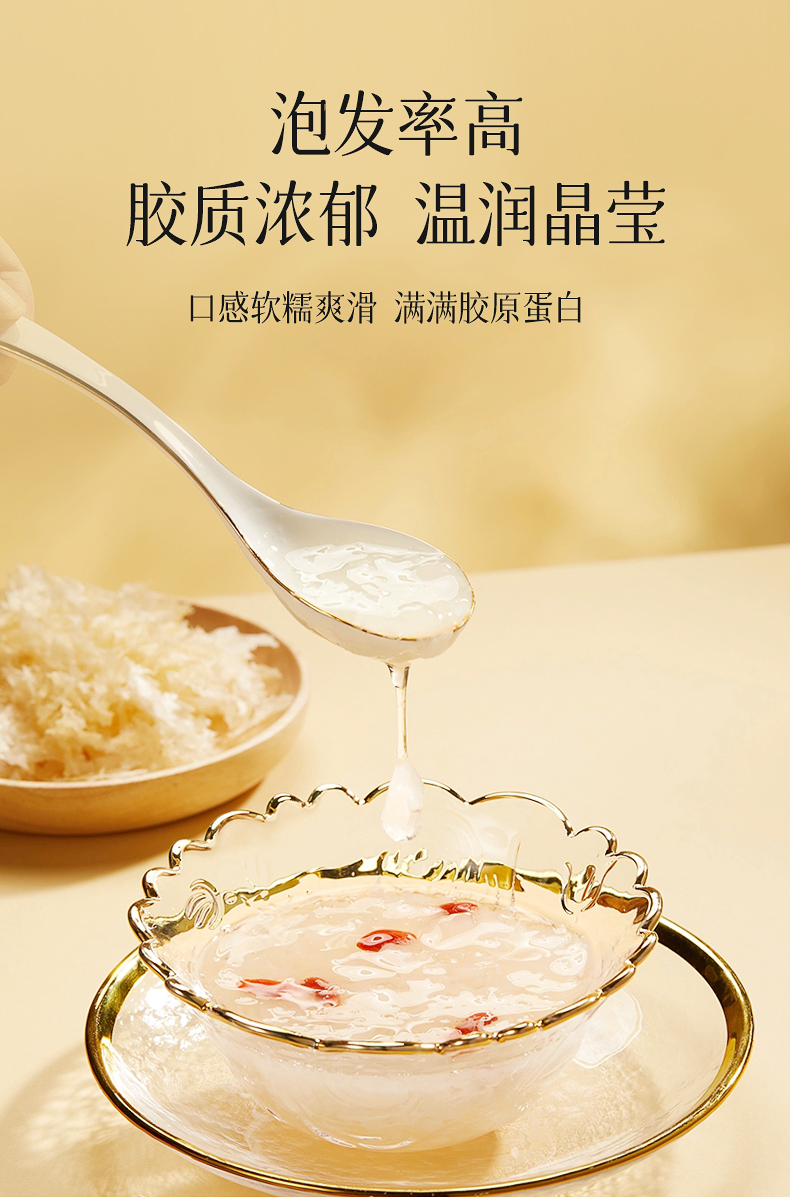 7、50g鲜银耳仅出3g干品(一罐银耳大约等于13朵鲜银耳),口感软糯、绵滑、营养丰富,0糖低脂 0添加,健康温补好吸收,价值超高低脂肪,无须担心长胖,小孩不用担心蛀牙问题,老年人不用担心升糖负担。
