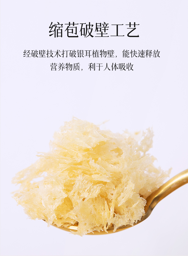 把鲜嫩耳瓣进行破壁处理,打破银耳孢子壁,让营养转化为小分子且充分释放,从而营养吸收成倍增加。