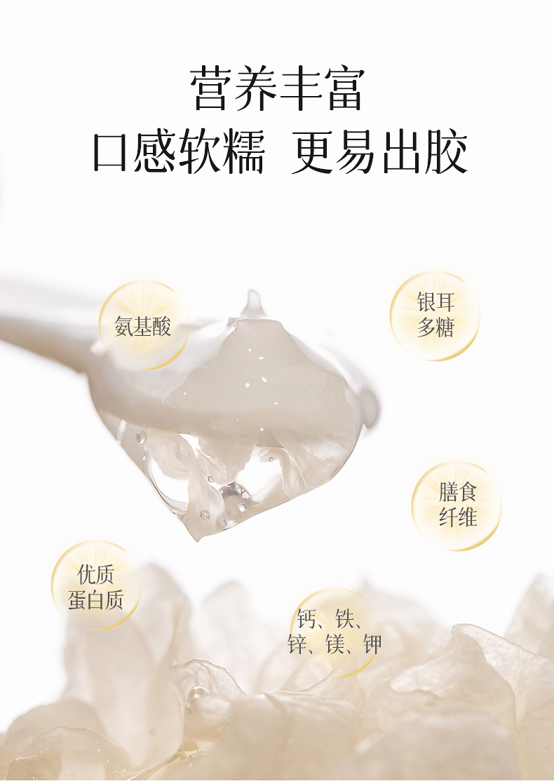 6、热水冲泡便能快速释放营养物质,膨胀率达到36倍,15分钟即可出浓稠胶质。营养全面,香醇糯滑,满满胶原蛋白。