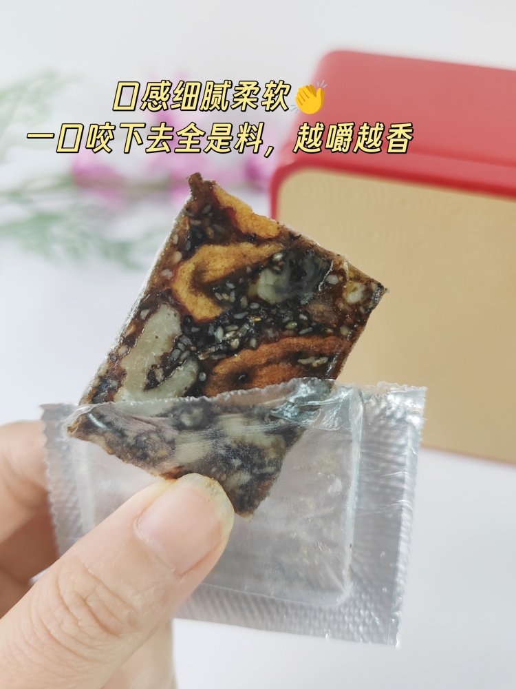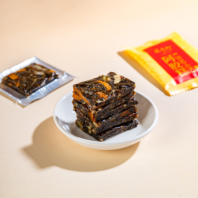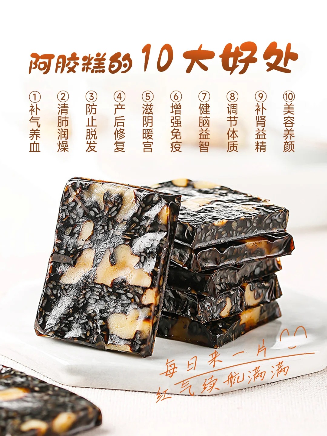 5.嚼劲十足:每块阿胶糕乌黑莹亮、果仁饱满,入口胶香浓郁,拉丝绵长,嚼劲十足,甜而不腻,回味甘醇无腥,真正做到“好胶看得见,好吃嚼得出”。