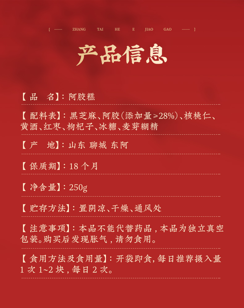 【注意事项】感冒、咳嗽、腹泻、女性生理期、手术期间、产后恶露未尽暂停食用阿胶糕。孕妇贫血在孕4-6个月(孕中期)可食用。遵医嘱服用。