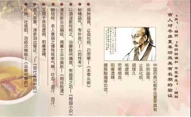 一千多年前,医学典籍《藏本草》记载,冬虫夏草有“润肺、补肾”之效。《本草纲目》记载:具有“润肺益肾”。明代中期,冬虫夏草流传到日本,被贵族们广泛食用。清代雍正或乾隆年间,冬虫夏草正式成为药材。