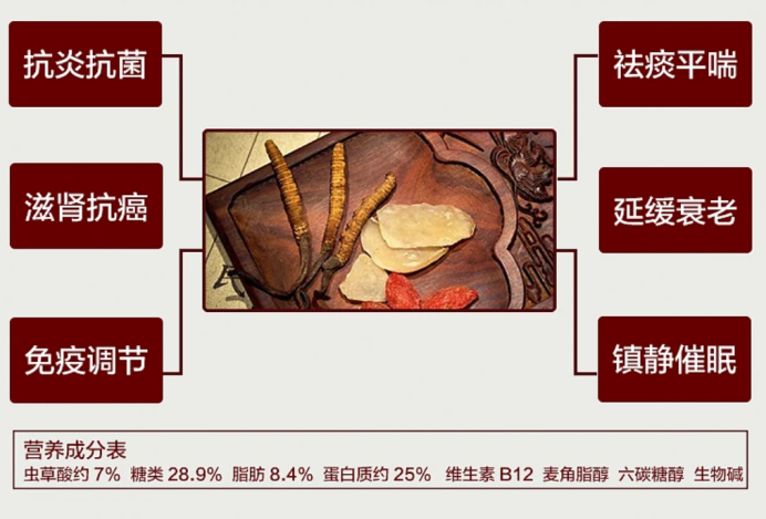 冬虫夏草被世人誉为“中华神草”、“百药之王”。它与人参、鹿茸齐名,并称为“中药三宝”,是上等的滋补品,有着极佳的补肾益肺的作用。