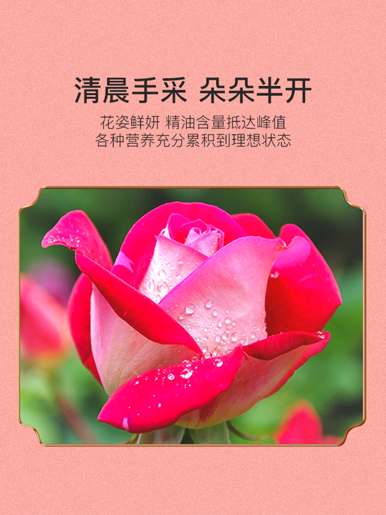 2、资深花农清晨手采,只选取半开花冠玫瑰,朵朵精油饱满。