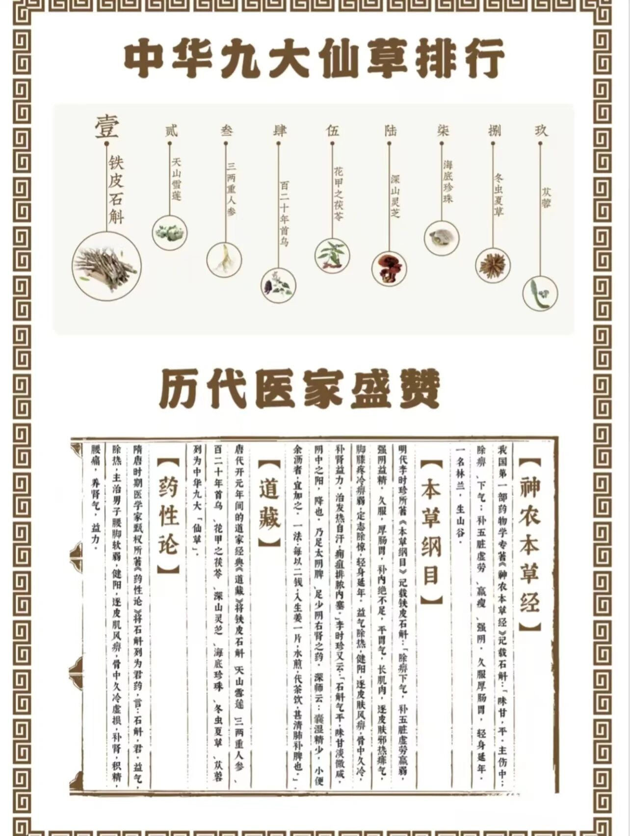 ✅在古代,铁皮石斛简直就是救命仙草,铁皮石斛入药是可以吊命的。历代名医华佗、张仲景、孙思邈、李时珍都钟爱铁皮石斛。