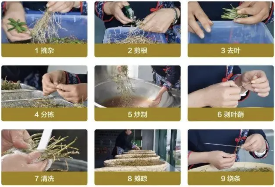 👉🏻挑杂、剪根、去叶、分拣、炒制、剥叶鞘