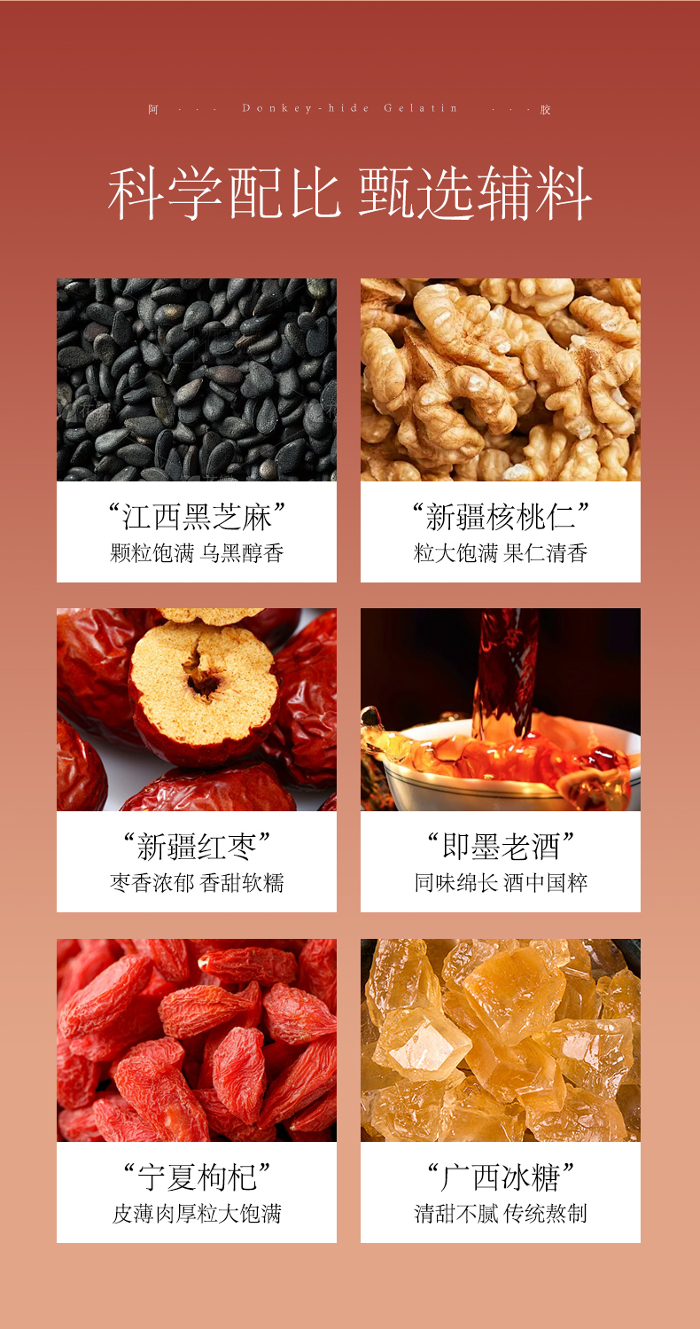 2.黄金配比,融合新疆核桃、和田红枣、宁夏枸杞、广西冰糖、江西黑芝麻、即墨老酒六味地道食材。