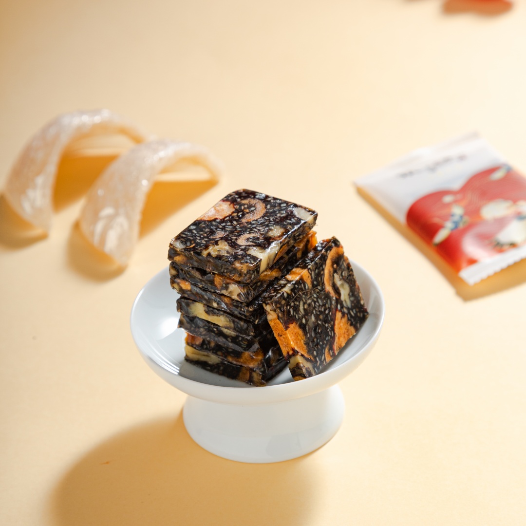 5.糕体乌黑莹亮,果仁饱满清晰可见,入口胶香浓郁,拉丝绵长超治愈,嚼劲十足不粘牙,甜而不腻回味甘醇。