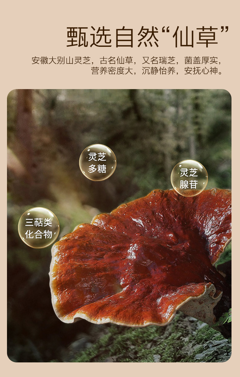 1、精选安徽大别山,独特气候与地理滋养,灵芝朵大形美、肉质醇厚,营养卓绝,自古被誉为“灵芝之圣”。