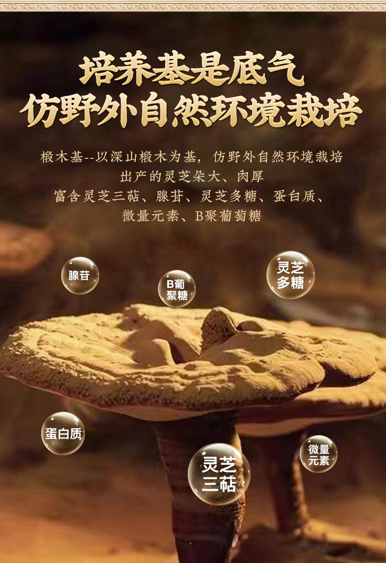 培养基以30年深山椴木为基,俗称“椴木灵芝”,最大程度的保留了赤灵芝的营养成分