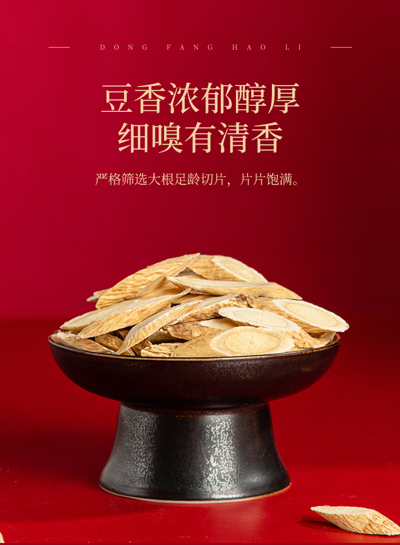 2.精选三年足龄黄芪主根,采用45°手工斜切工艺,有效促进营养成分释放;结合低温烘干技术,最大限度保留黄芪活性成分与本真风味