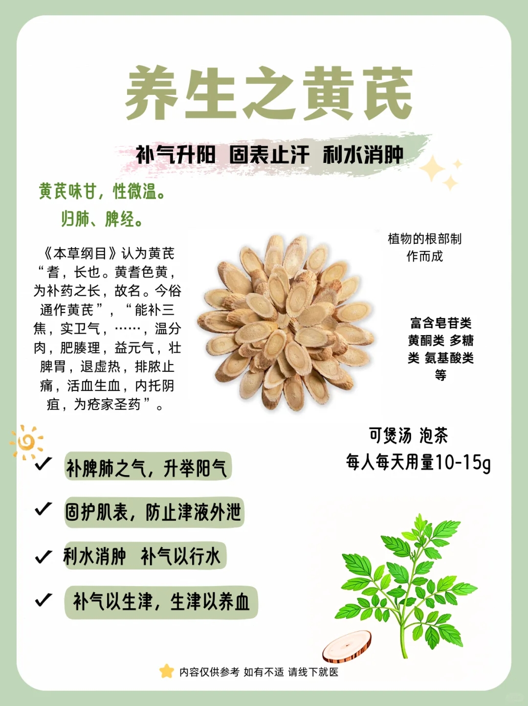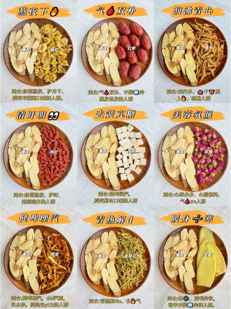 ✅熬夜急救:黄芪补气,适合熬夜后脸黄、乏力。