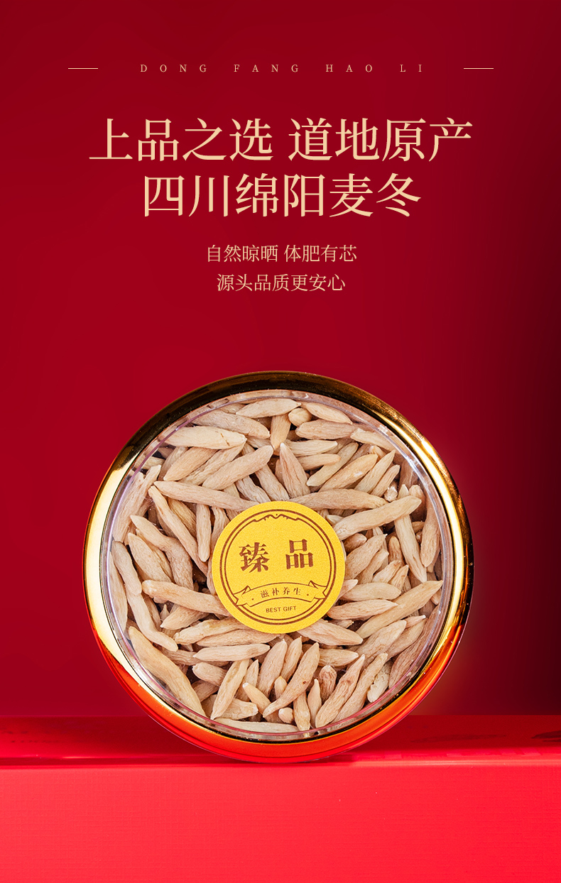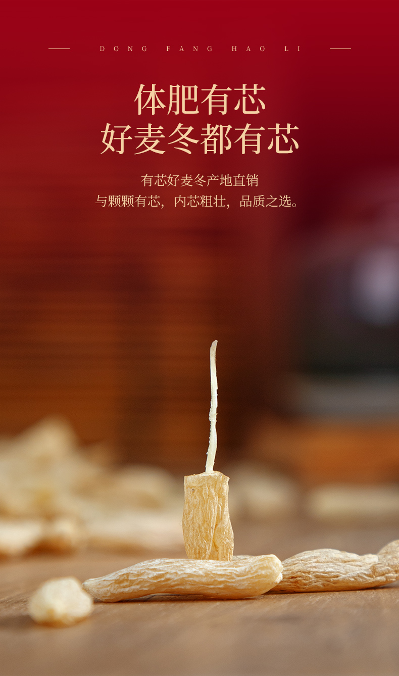2.历经 3 次手工精挑细选,只留颗粒饱满、呈标准纺锤形、两端略尖、中柱细小的优质麦冬,保留土生土长的自然原色,每一颗都是原生态滋补臻品。