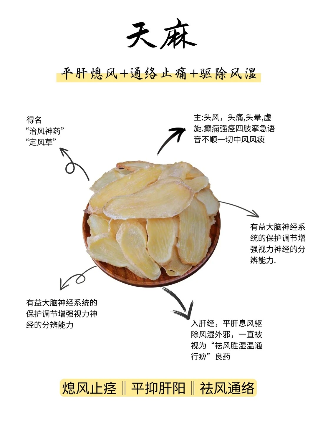 天麻性平,清润平养:归肝经,擅于应对日常的头晕目眩、用脑过度与睡眠不安,为身体带来一缕清明与安宁。