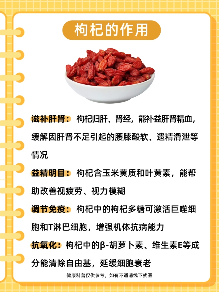 枸杞性平,温润滋养:归肝、肾经,有“明眼子”美誉,适合长期面对屏幕、精力消耗大的人群,润养双目,补充精力。