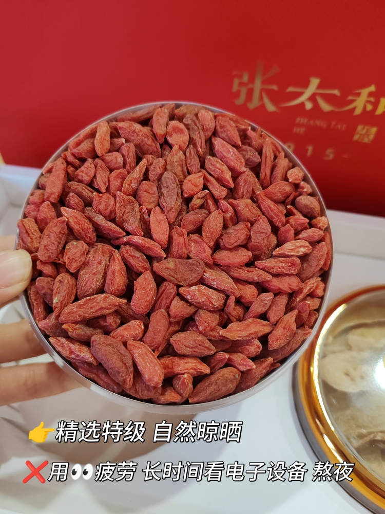 2.宁夏中宁红枸杞:精选宁夏中宁头茬枸杞,果形饱满、色泽鲜红透亮,肉质厚实少籽。全程无硫熏、无添加,经自然晾晒而成,泡水后汤色清亮,滋味甘甜,保留枸杞天然营养与醇香。