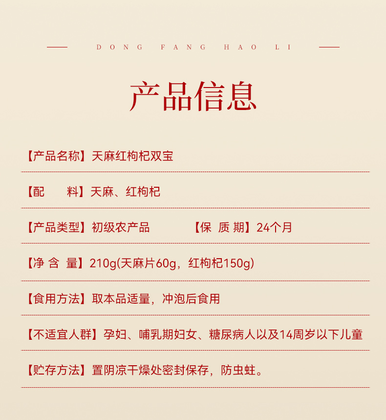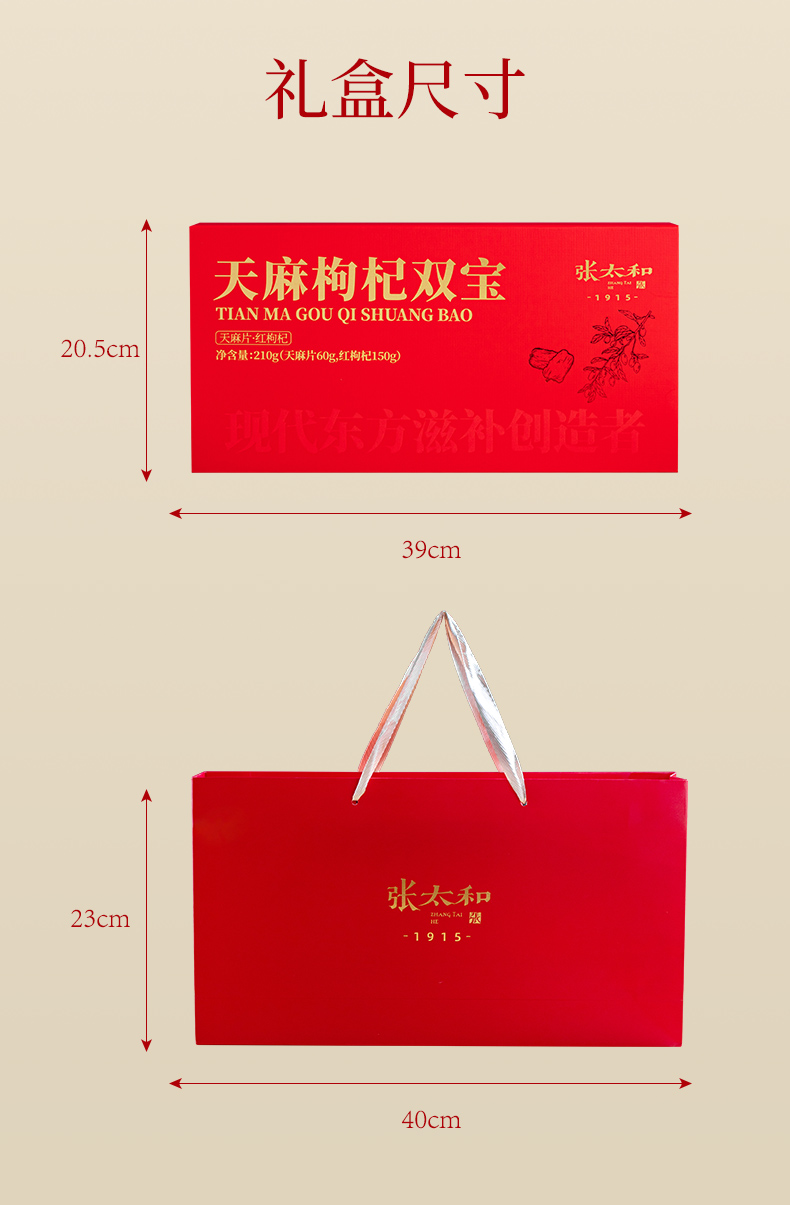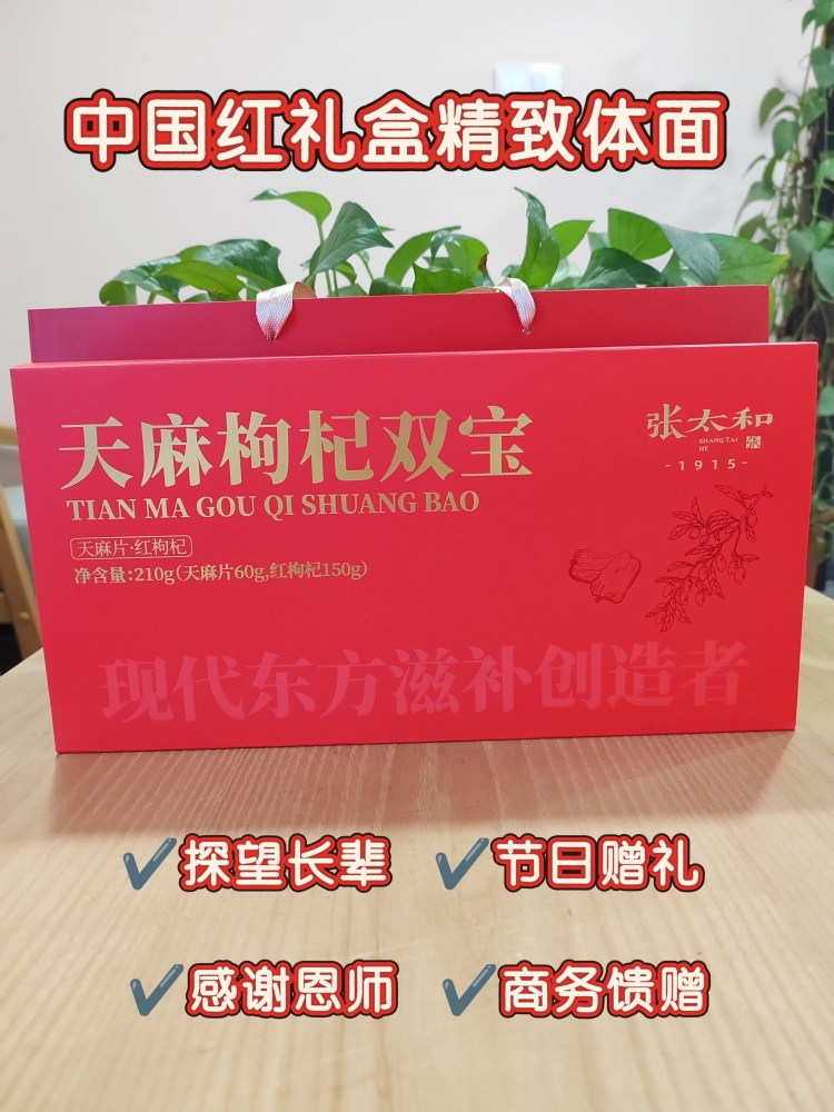 4.210g 科学配比,精致礼盒装:内含天麻片 60g + 红枸杞 150g,分量充足,满足长期食用需求。高级中国红礼盒设计,搭配同款礼袋,拎握方便超省心。无论是走亲访友、探望长辈还是商务馈赠,送的是健康双宝,更是满满的心意与体面。
