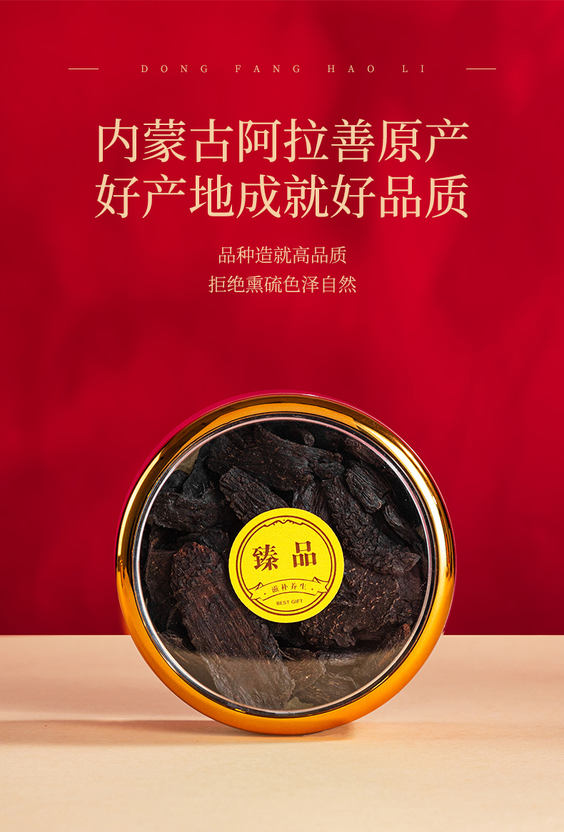 2.内蒙古阿拉善优质肉苁蓉:甄选内蒙古阿拉善道地肉苁蓉,生长于沙漠腹地,受昼夜温差大、光照充足的环境滋养,肉质肥厚、质地坚实。经自然晾晒加工,无添加无熏硫,片型规整,泡水后口感温润、滋味淡甜,完整留存肉苁蓉温补肾阳、润肠通便的营养成分。