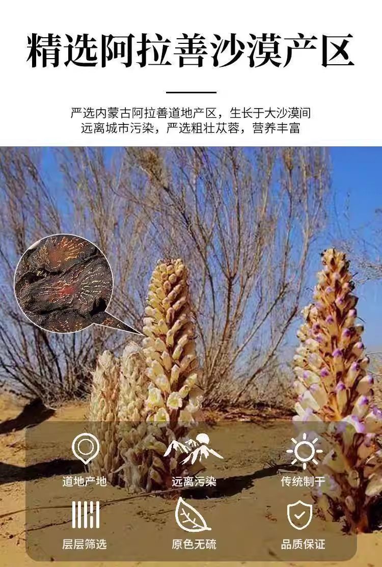 1.源自内蒙古阿拉善 —— 肉苁蓉的传统产区、主产区与道地产区。这里独特的沙漠气候、土壤条件,孕育出的肉苁蓉以油润饱满、质地柔软、口感甘醇而闻名。