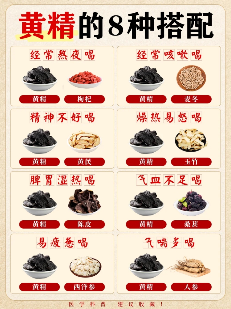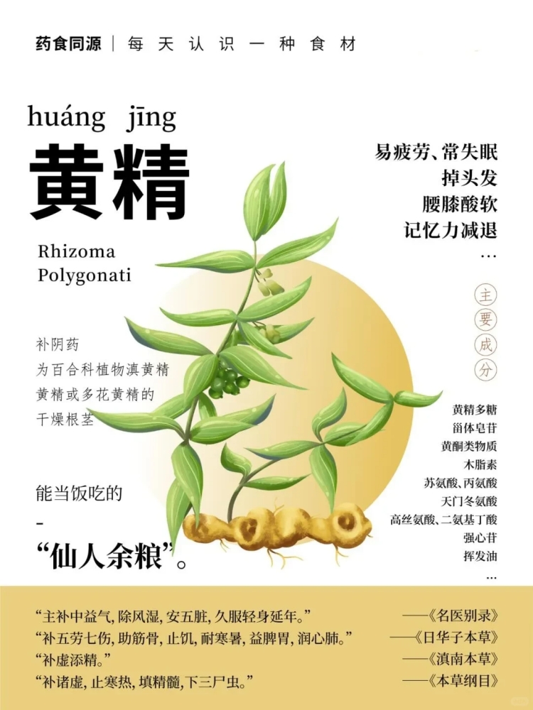 黄精性平,填精补益:归脾、肺、肾经,是传统的“仙人粮”,其温和补养之力尤适合精力不济、日常疲劳、需要固本培元的人群。