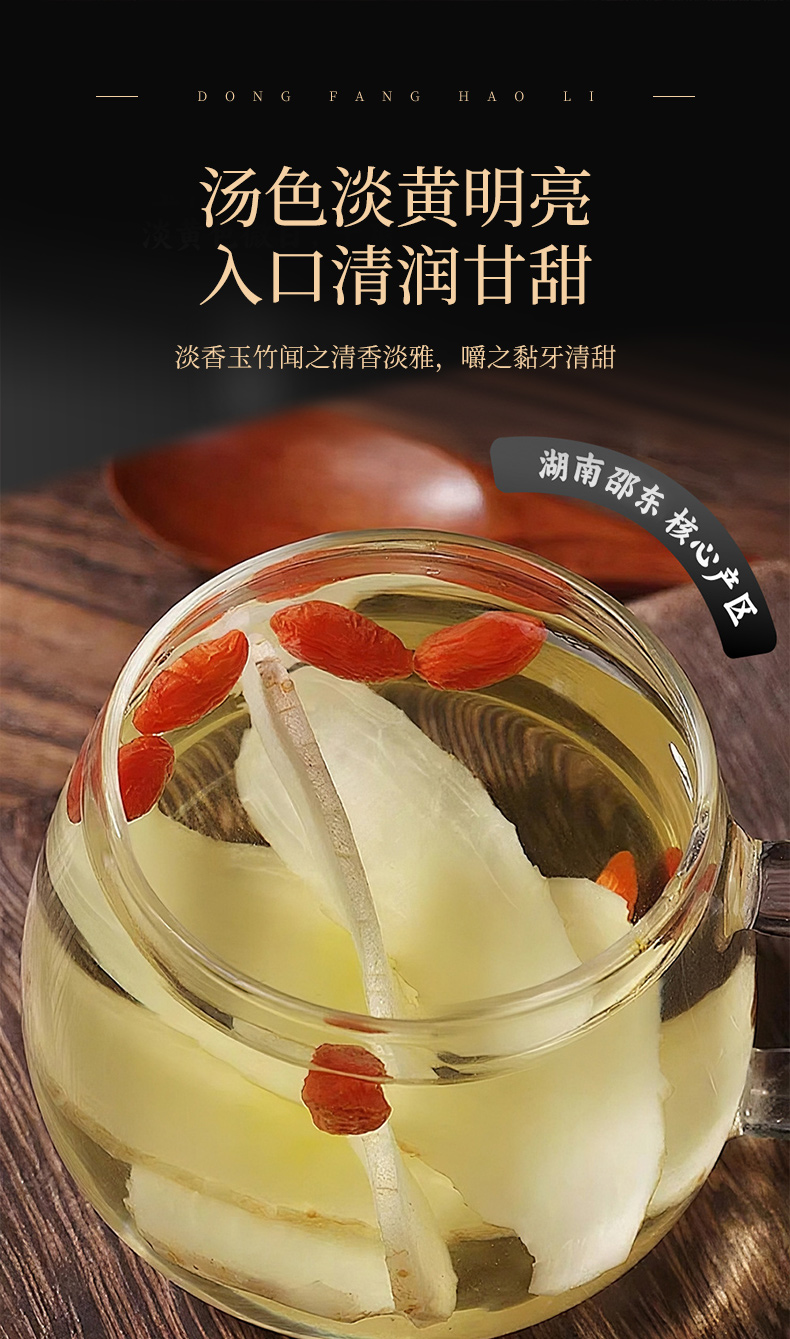1.九华山九制黄精:严选九华山核心产区 8 年足龄黄精,深山原生态环境滋养,根茎肥厚饱满、肉质细腻。遵循古法九蒸九晒工艺,充分激发营养成分,去除生黄精寒性,口感软糯香甜、胶质充盈,入口无渣,久泡久煮营养不流失,温和滋养力更醇厚。2.湖南邵东优质玉竹:甄选湖南邵东道地玉竹,当地温润气候与肥沃土壤孕育出的玉竹,根茎粗壮、质地坚实。经传统工艺加工干燥,片型规整均匀,色泽自然微黄,断面肉质细腻,泡水后汤色清亮,滋味清甜,保留玉竹天然润养成分。