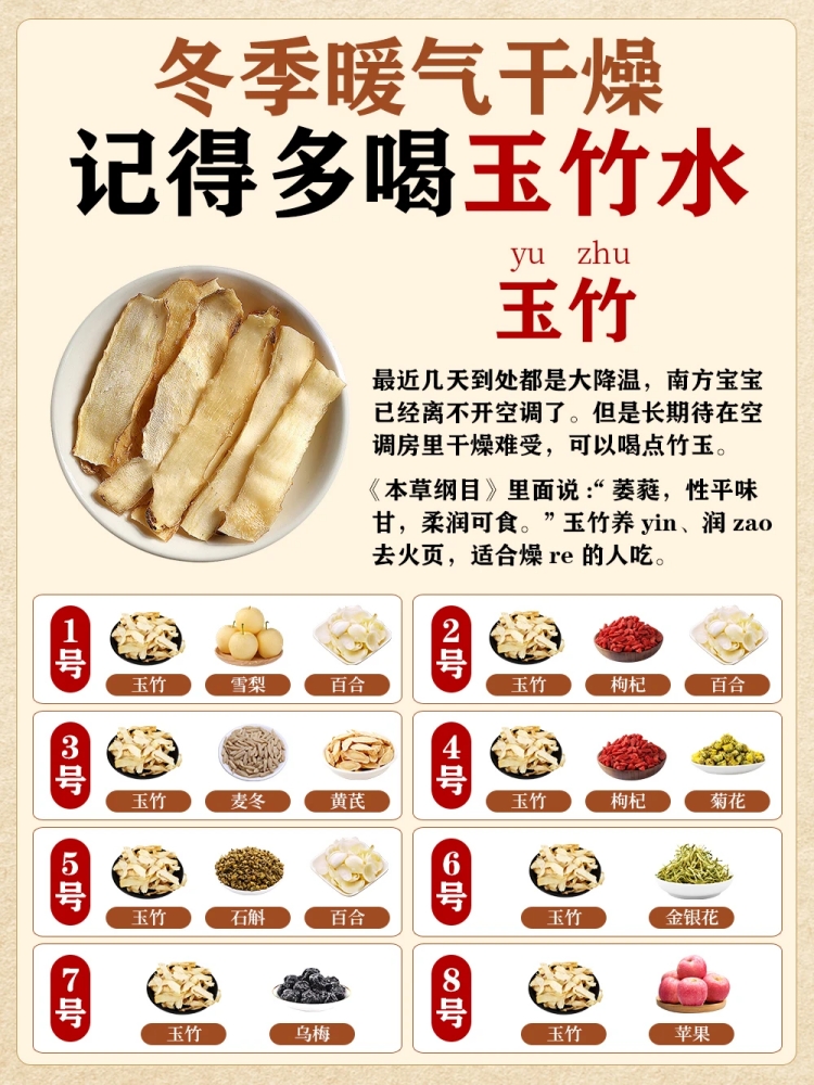 玉竹性平,生津润燥:归肺、胃经,擅长滋养津液,尤其适合应对秋冬干燥、熬夜或烟酒所致的口干舌燥与肌肤干涸。
