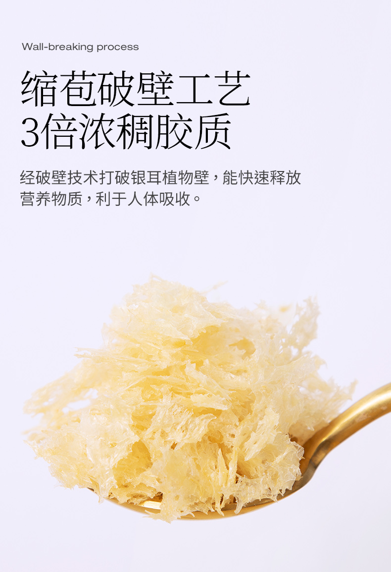 把鲜嫩耳瓣进行破壁处理,打破银耳孢子壁,让营养转化为小分子且充分释放,从而营养吸收成倍增加。