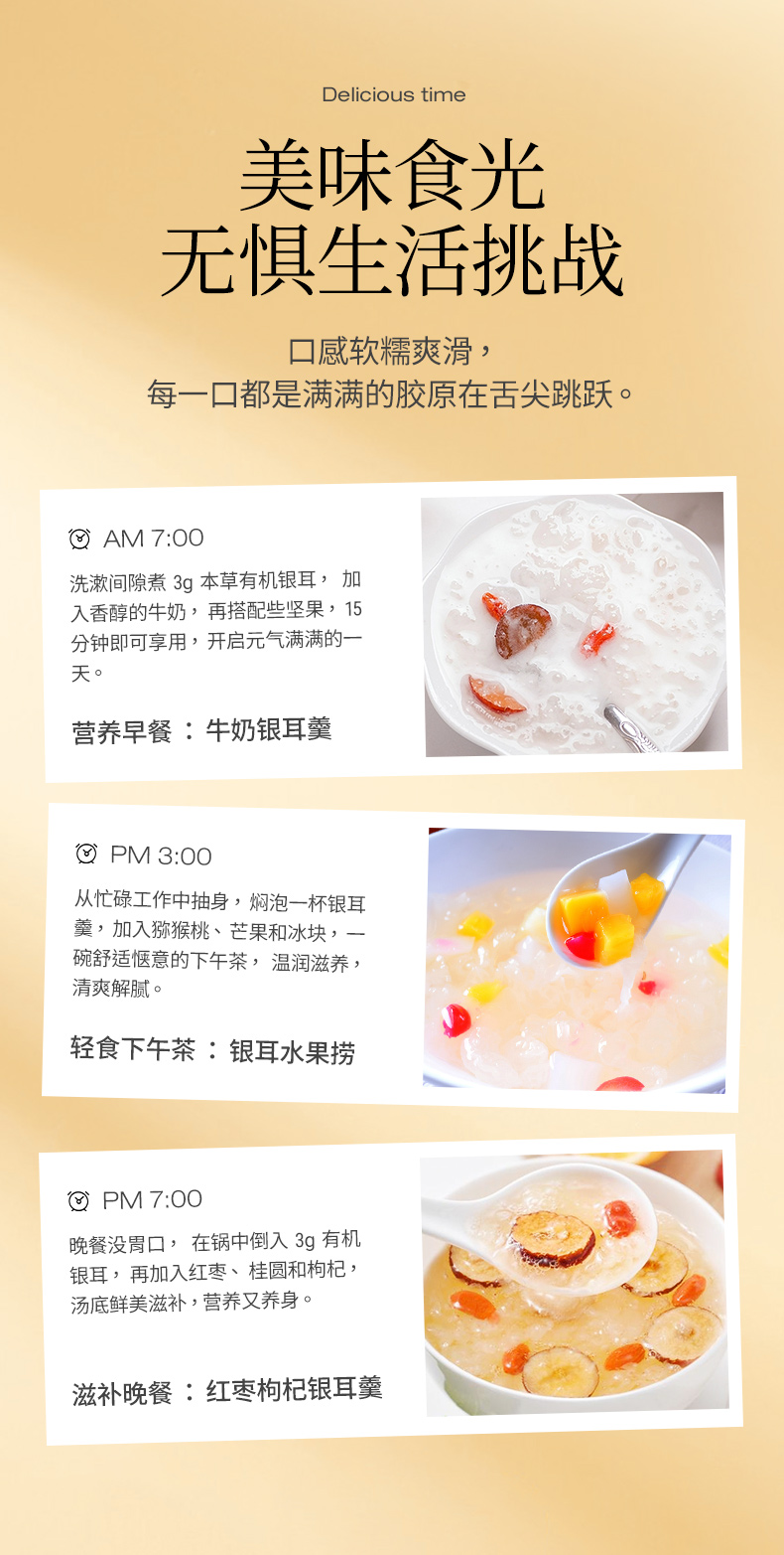 7、50g鲜银耳仅出3g干品(一罐银耳大约等于13朵鲜银耳),口感软糯、绵滑、营养丰富,0糖低脂 0添加,健康温补好吸收,价值超高低脂肪,无须担心长胖,小孩不用担心蛀牙问题,老年人不用担心升糖负担。