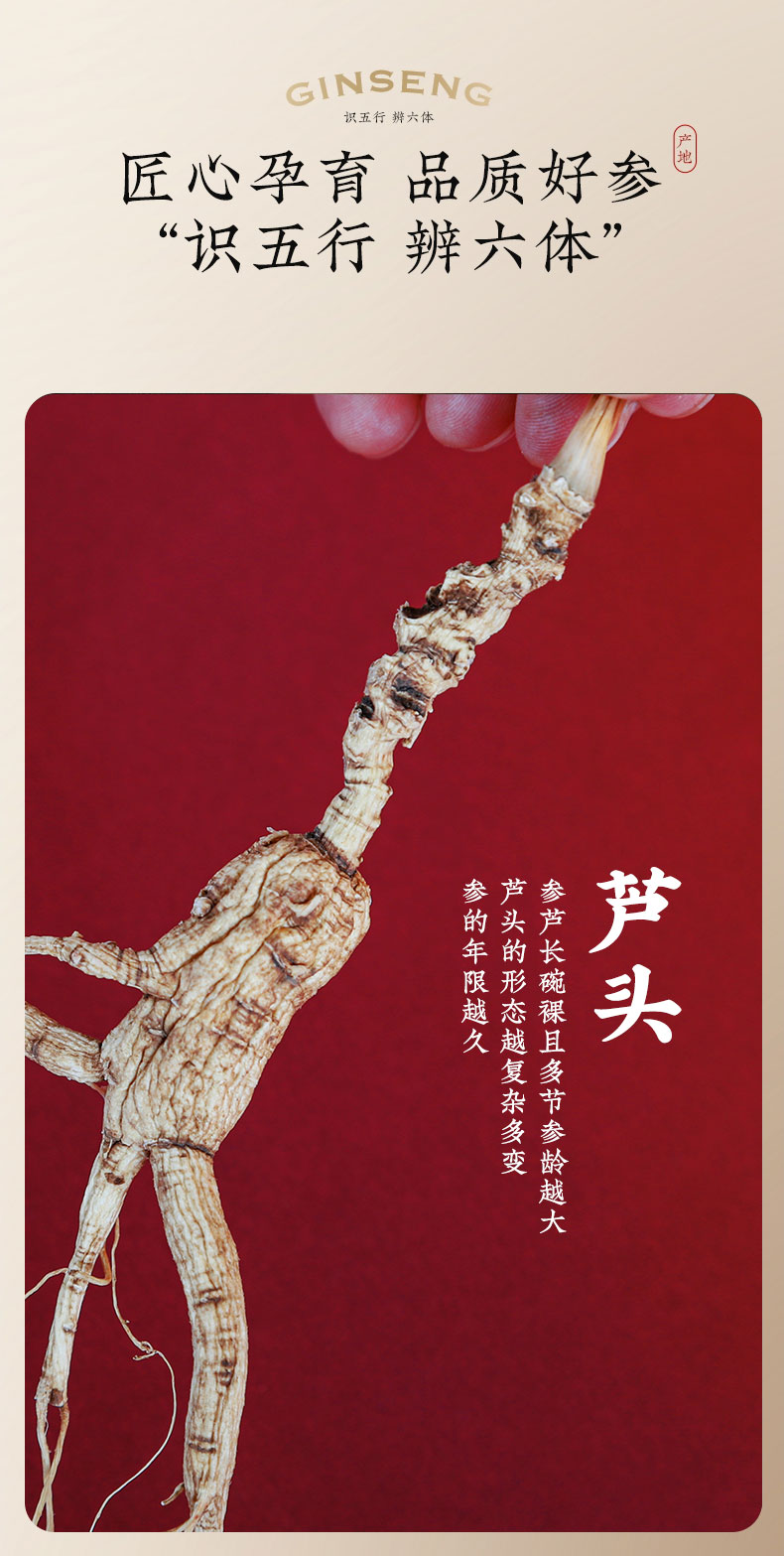 参龄 20 年,属于稀缺老参,滋补效果更强劲! 参形优美,芦头饱满,是身份与品质的象征。实木礼盒,高端感拉满,送给长辈或领导尽显诚意。
