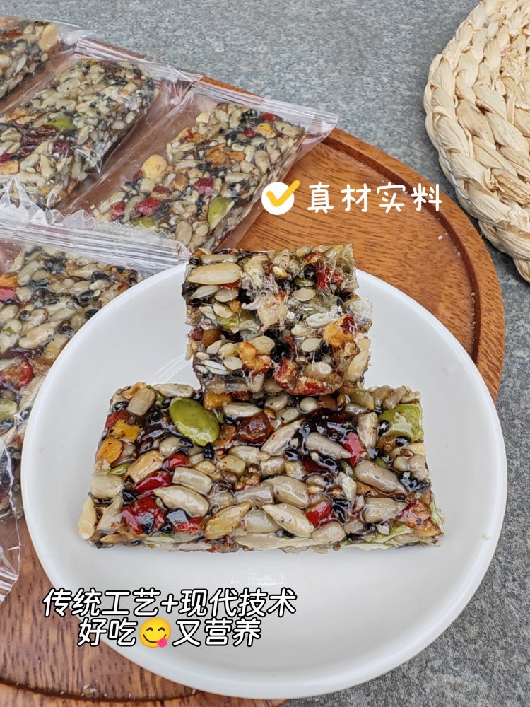 1.精选瓜子仁、红枣、南瓜籽仁、黄芪、葡萄干、党参、花生碎、黑芝麻八种食材足料添加,坚果、籽类、果类丰富搭配,真材实料。